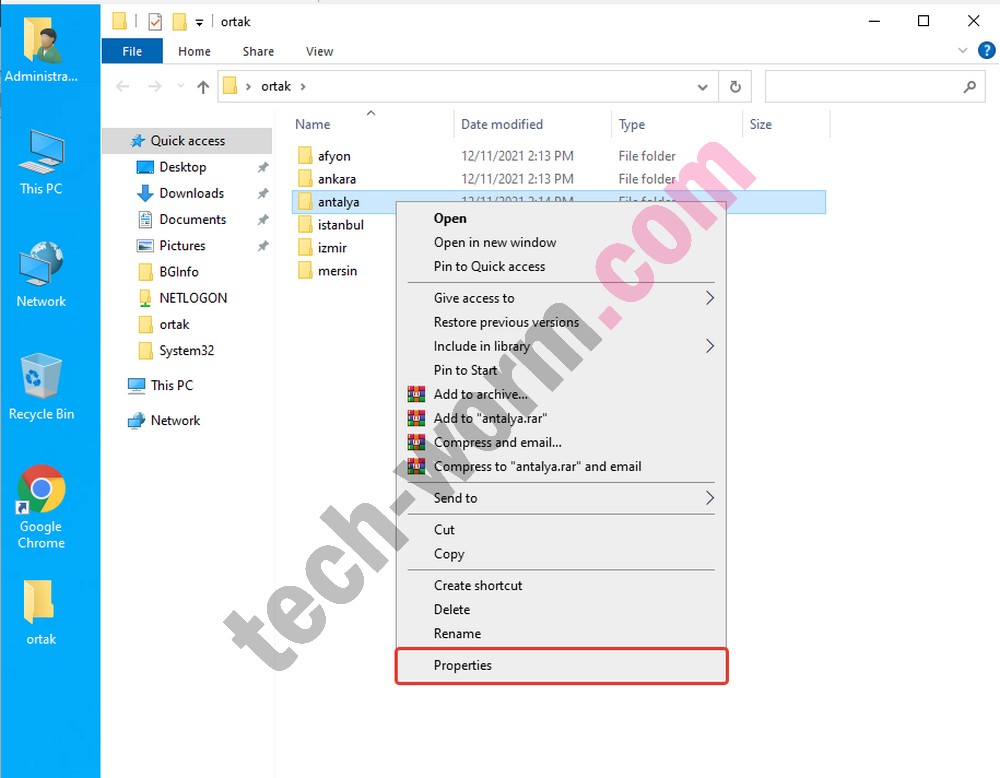 6- Şimdi ortak klasörün içine girelim ve sırayla il klasörlerinin üzerini sap tıklayarak “Properties/Özellikleri” seçelim.