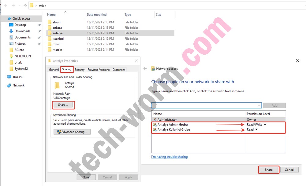 8- Bu aşamada iseAdvanced Sharing sekmesinden üstteki gibi ilerleyerek ilin kullanıcı ve admin gruplarını bularak paylaşıma açalım. Kullanıcı gruplarına sadece okuma (read), admin gruplarına ise sadece okuma/yazma (read/write) yetkisi vermeyi unutmayın.