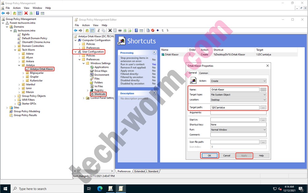 9- Burada ise Group Policy Managament sayfası açalım ve yeni bir GPO oluşturalım. Oluşturduğumuz GPO‘ya o ilin ismini verdikten sonra aşağıdaki gibi düzenle kısmından “User Configration | Preferences | Windows Settings | Shortcuts” kısmına kadar ilerleyip aşağıdaki gibi yeni bir “Shortcuts/Kısayol” oluşturalım ve Apply/OK diyelim.
