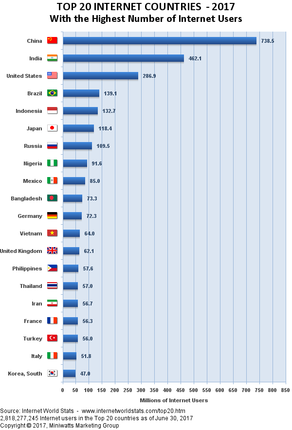 Dünya internet kullanımında kuşkusuz dünyanın en kalabalık nüfusuna sahip olan Çin ile ilk sırada yer alıyor. Sıralamanın devamını ise Hindistan, ABD, Breazilya, Endonezya, Japonya, Rusya oluşturuyor. Türkiye’ye baktığımızda 80 milyonluk nüfusun 56 milyonu aktif internet ve facebook kullanıyor. Kısaca her internet kullanıcı neredeyse bir facebook kullanıcısı. Buradaki dikkat çeken detay ise 1.4 milyarlık nufusa sahip Çin’in 738 milyonu aktif internet kullanmakta ve aktif facebook kullanıcı sayısı 2014 yılında 54 milyon civarında.