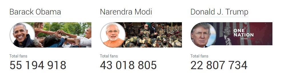 Dünyada toplum bazında takipçi sayısı en fazla olan kişiler sıralamasında ilk sırada Amerika Birleşik Devletleri’nin eski devlet başkanı olan Barack OBAMA, ikinci sırada 2014 Hint genel seçimlerinde belirleyici bir zafer ile Bharatiya Janata Partisi lideri olduktan sonra Hindistan Başbakanı olan Hint bir politikacı olan Narendra Damodardas Modi ve üçüncü sırada Amerikalı iş adamı, siyasetçi ve Amerika Birleşik Devletleri’nin günümüzdeki başkanı Donald John Trump geliyor.