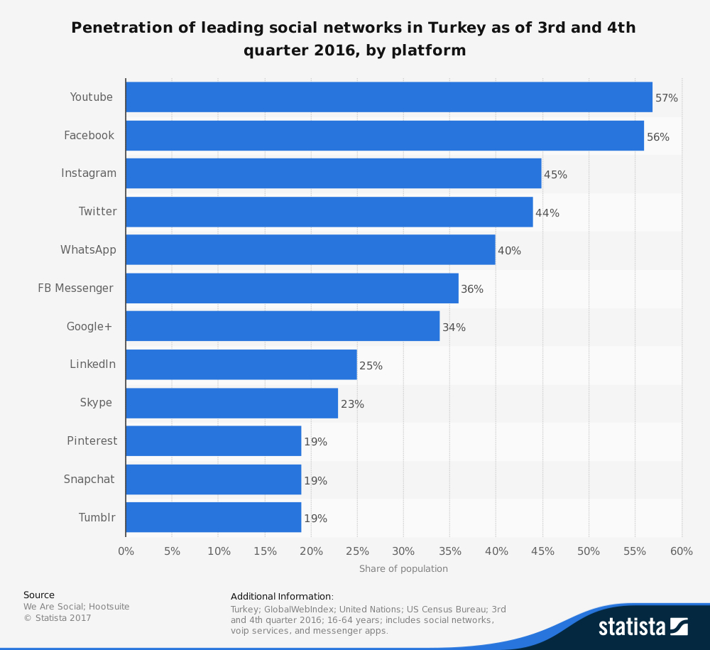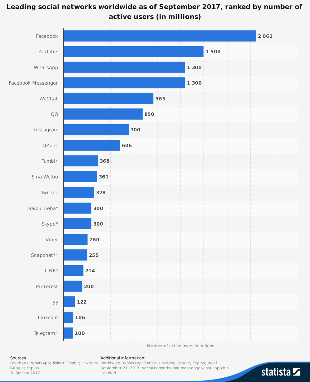 Aşağıdaki listeden de anlaşılacağı üzere dünyanın en çok kullanılan sosyal medya ağlarını sıraladığımızda Facebook 2 milyar, Youtube 1.5 milyar, WhatsApp 1.3 milyar, Facebook Messenger 1.3 milyar, WeChat 963 milyon, QQ 850 milyon, Instagram 700 milyon kullanıcı ile dünyanın en çok kullanıcıya sahip 7 platformu olduğunu görüyoruz.