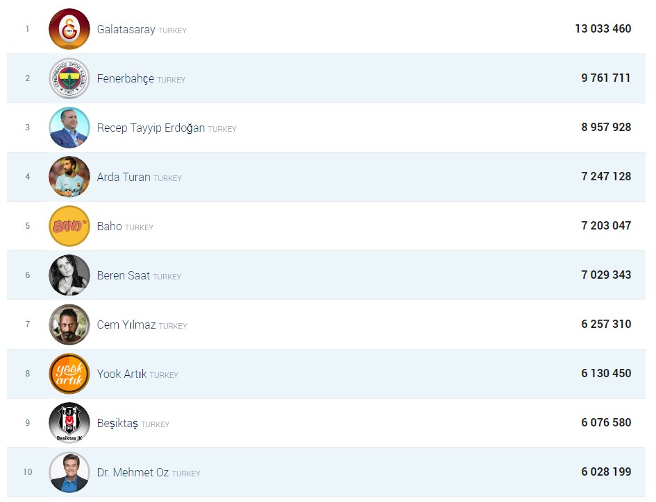 Aşağıdaki liste Türkiye’de Facebook kullanıcılarının en çok takip ettiği sayfaları göstermektedir. Bu listeye göre ilk üç sırada Galatasaray, Fenerbahçe, Cumhurbaşkanımız Sayın Recep Tayyip Erdoğan geliyor.