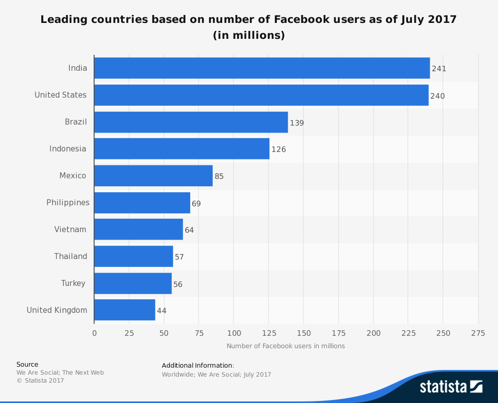 Ülkelere göre kullanıcı sayısına baktığımızda Hindistan Faccebook kullanımında 241 milyon aktif üye ile ilk sırada yer almaktadır. Sıralamanın devamında 240 milyon kullanıcı ile ABD, 139 milyon kullanıcı ile Brezilya, 126 milyon ile Endonezya, 85 milyon ile Meksika, 69 milyon ile Filipinler, 64 Milyon ile Vietnam, 57 milyon ile Tayland ve 56 milyon ile 9. sıradaTürkiye gelmektedir. İngiltere ise 10. sıra ile 44 milyon kullanıcısı bulunmaktadır.