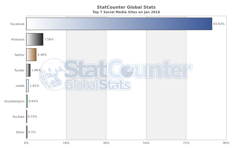 Bu yazımızda dünyada en çok kullanılan sosyal medya ile ilgili bilgi vermeye çalışacağız. Aşağıdaki StatCounter’in verdiği tabloyu incelediğimiz de %83.63 ile Facebook ve %7.56 ile Pinterestin olduğunu görüyoruz. Twitter ise %4.48’lik bir orana sahip.