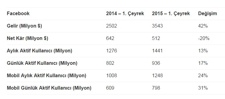 Facebook dünya üzerinde en çok kullanılan sosyal medya sitelerinden. 2014 yılını 1 milyar 390 milyon aylık aktif kullanıcı sayısı bulunan Facebook, 2015 yılının ilk 3 ayında elde edilen verilere göre 51 milyon yeni kullanıcı kazanmış ve toplam kullanıcı sayısı 1 milyar 441 milyona ulaştı. Facebook 1.4 milyar kullanıcı sayısına gelirken, Twitter’ın ise hali hazırda yaklaşık 500 milyon kullanıcı sayısı bulunuyor.