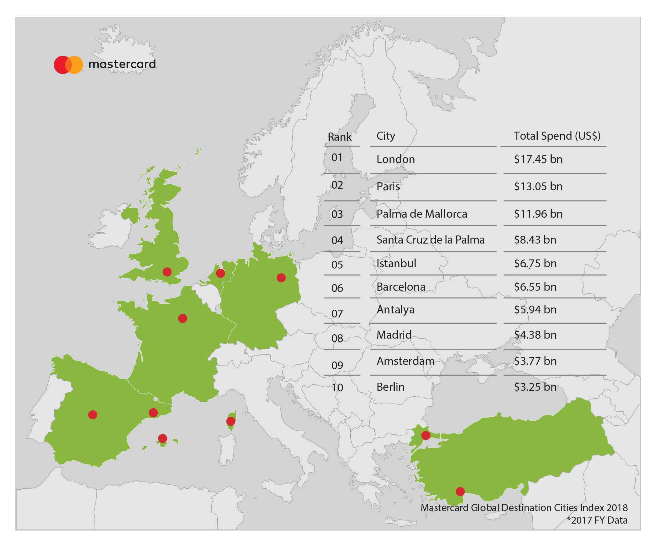 Dünyanın en çok seyahat edilen 162 şehri için, turistik ziyaret ve harcama trendlerini inceleyen raporda; İstanbul, Avrupa yatılı ziyaretçi sayısı sıralamasında üçüncülüğünü korurken, dünyada ise bir basamak yükselerek 9. sıraya çıktı. Bir önceki yıl yayınlanan araştırmaya göre 2017 yılı sonunda 9,5 milyon yatılı ziyaretçi öngörülen İstanbul, beklentilerin de ötesine çıkarak 2018 yılında 10,7 milyon ziyaretçiye ulaştı. Mastercard‘ın paylaştığı verilere göre, İstanbul ziyaretlerinin yüzde 90’a yakını turistik amaçlı, geri kalanı ise iş seyahatiydi. Raporda İstanbul’u ziyaret eden seyahat severlerin 2016 yılında toplamda 5,80 milyar dolara yakın harcama yaptıklarını, 2017 yılında ise bu rakamın 6,75 milyar dolara yükseldiğini ortaya koydu. İstanbul’a en çok turist gönderen ülkeler sırasıyla Rusya, İran ve Almanya oldu.