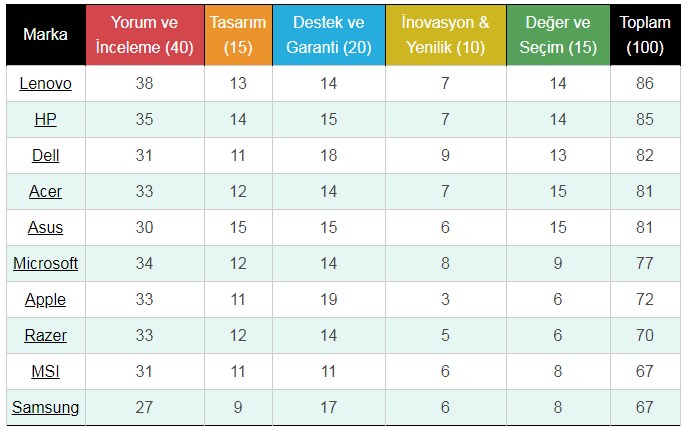 Burada her bir dizüstü bilgisayar markasına 100 puanlık bir ölçekte bir puan verildi. Puanlar beş kategoride değerlendirilmiştir: Yorum/İnceleme, Tasarım, Teknik Destek/Garanti, İnovasyon (Yenilik) ve Değer ve Seçim sonucunda elde edilen veriler hesaplanarak toplam olarak puanlandırılır.
