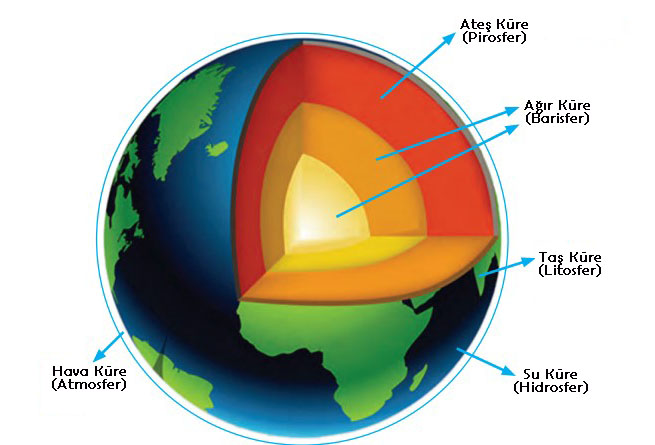 Yerküremiz yer altına doğru toplam 5 tabakadan oluşmuştur. Bunlar, Hava Küre (Atmosfer), Su Küre (Hidrosfer), Taş Küre (Litosfer), Ateş Küre (Pirosfer) ve Ağır Küre (Barisfer)‘dir.