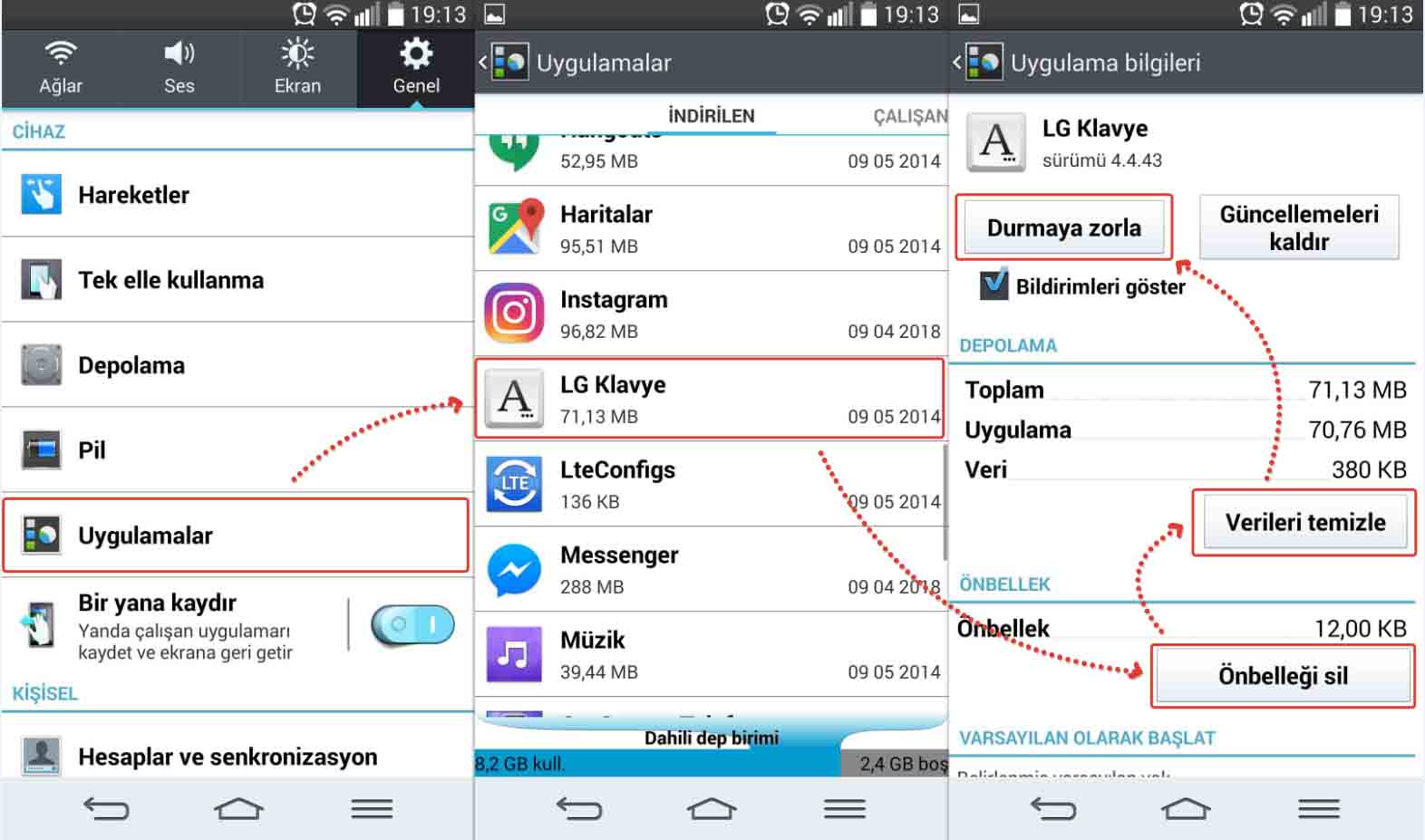 Bu sorunun çözümü ise oldukça basit. Telefonunuzun Ayarlar > Genel > Uygulamalar kısmında LG Klavye sekmesini seçiyoruz. Buradan sırasıyla “Ön Belleği Sil >Verileri Temizle > Durmaya Zorla” diyoruz. İşlemimiz tamam. Şimdi klavyenizden mesaj yazmaya başlayabilirsiniz. Eğer sorun devam ederse aşağıdaki “Güncellemeleri Kaldır” seçeneğini seçerek tekrar kontrol edin.