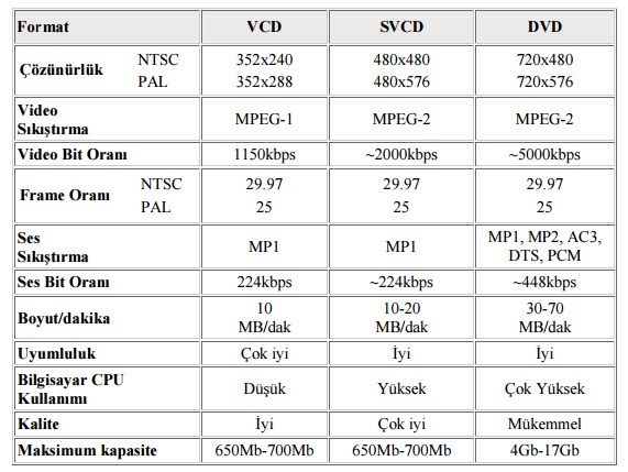 VCD, SVCD ve DVD’lerin teknik olarak karşılaştırılması verilmiştir.