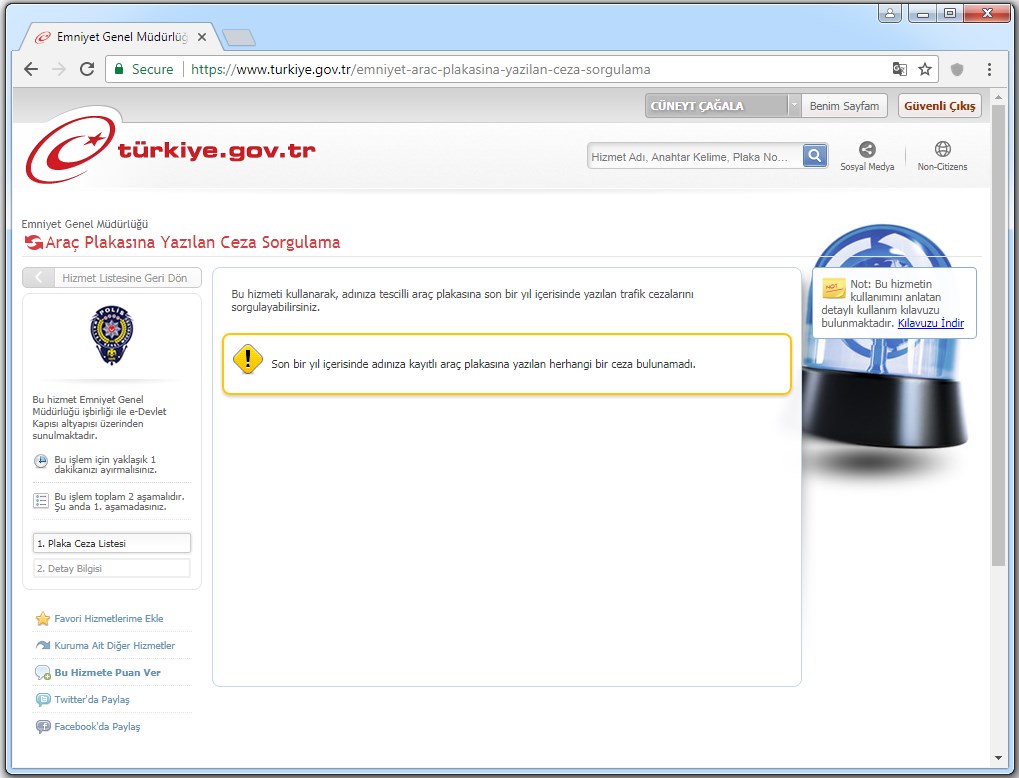 3- Son olarak aşağıdaki gibi bir pencere açılacak. Eğer adınıza yazılmış bir ceza varsa burada görüntülenecek. Bazen cezalar sisteme geç düşebiliyor. Eğer ceza varsa herhangi bir bankadan, mobil bankacılıktan veya internet vergi dairesinden (buradan) ödeme yapabilirsiniz.