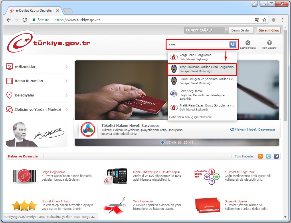 2- Açılan pencerede sağ üstte bulunan arama kısmına CEZA yazın. Küçük bir panel açılacaktır. Burada Araç Plakasına Yazılan Ceza Sorgulama sekmesini seçin.