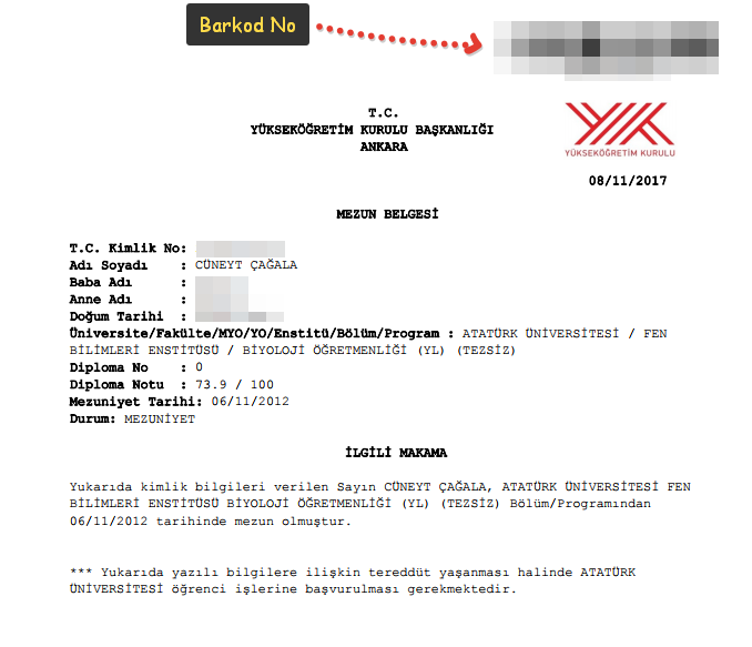 Herhangi bir üniversiteden mezunsanız e-devlet (https://www.turkiye.gov.tr) üzerinden mezun olduğunuz üniversiteleri görüntüleyebilir ve bu üniversitelerden mezun olduğunuza dair belgeye ulaşabilirsiniz. Yükseköğretim Kurulu Başkanlığı tarafından e-devlet üzerinden sağlanan bu hizmete “Yükseköğretim Mezun Belgesi Sorgulama” sekmesinden ulaşabilirsiniz.