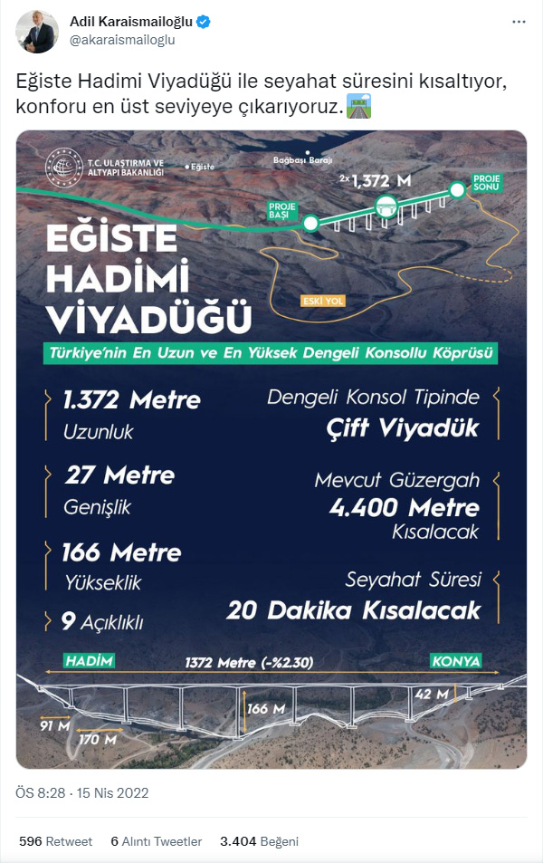 Konya‘da yapımı tamamlanan ve Akdeniz ile İç Anadolu‘yu kesintisiz birbirine bağlayan Eğiste Hadimi Viyadüğü Türkiye’nin en yüksek ve en uzun dengeli konsol köprüsü unvanını taşıyor.