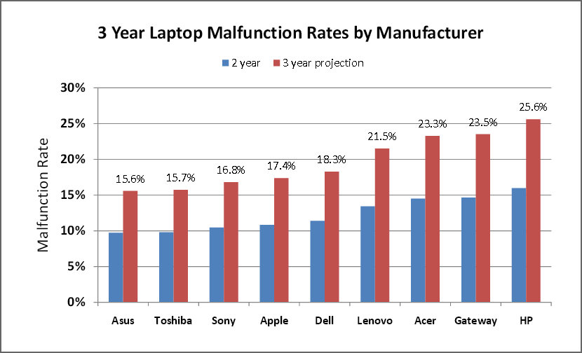 Laptopların donanım hatalarından kaynaklanan % 20 veya daha yüksek arıza oranı genellikle çok pahalı dizüstü bilgisayarlarda olacağı tahmin edilmektedir. Bilişim otoriteleri tarafından Asus ve Toshiba en güvenilir üreticiler olarak kabul edilmektedir. Grafiktende anlaşılacağı üzere Asus ve Toshiba 3 yıl içerisinde %15 gibi bir oranla en az arıza çıkaran laptop markaları olarak karşımıza çıkmaktadır. Listenin devamında Sony, Apple ve Dell hatırı sayılır bir düşük oranda arıza çıkardığı görülmektedir.