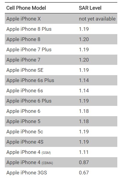 Amerika Birleşik Devletleri: Federal İleşitim Komisyonu (FCC), satılan telefonların 1 gramlık doku üzerinde 1.6 W/kg veya daha az SAR düzeyine sahip olmasını gerektirmektedir.
