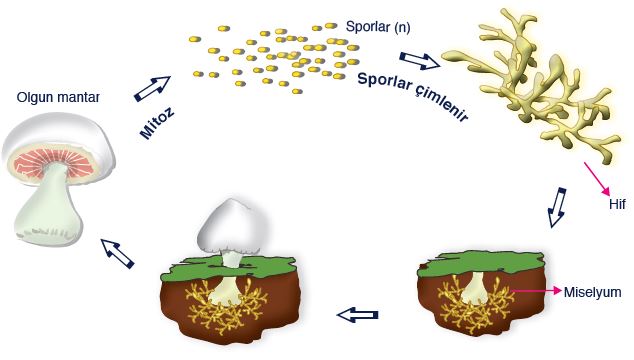Mantarlar eşeysiz üreme sırasında olgunlaşarak her spor kesesi n kromozomlu sporlar oluşturur. Rüzgar, su ile uygun ortama taşınan spor, müsilaj salgılayarak tutunur. Daha sonra hif ve miseller gelişir. Hiflerin bir kısmı yüzeye dik büyür ve uçlarında spor kesesi gelişir.