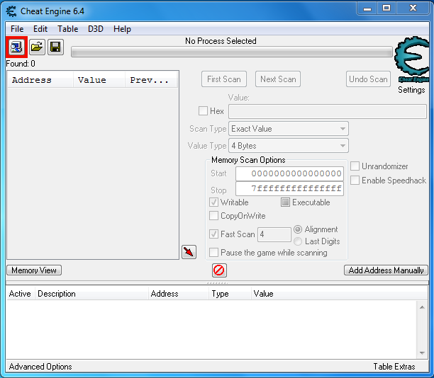1- Kurduğumuz Cheat Engine programımızı açalım ve allta gösterdiğim kırmızı kare kısmı tıklayın.