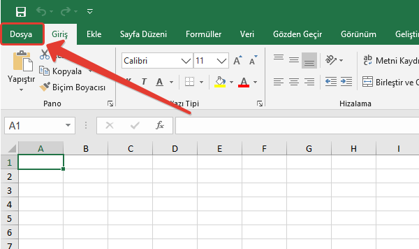 1-İlk olarak bir Excel sayfası açalım ve sol üst kısımda dosya yazan yeri klikleyelim.