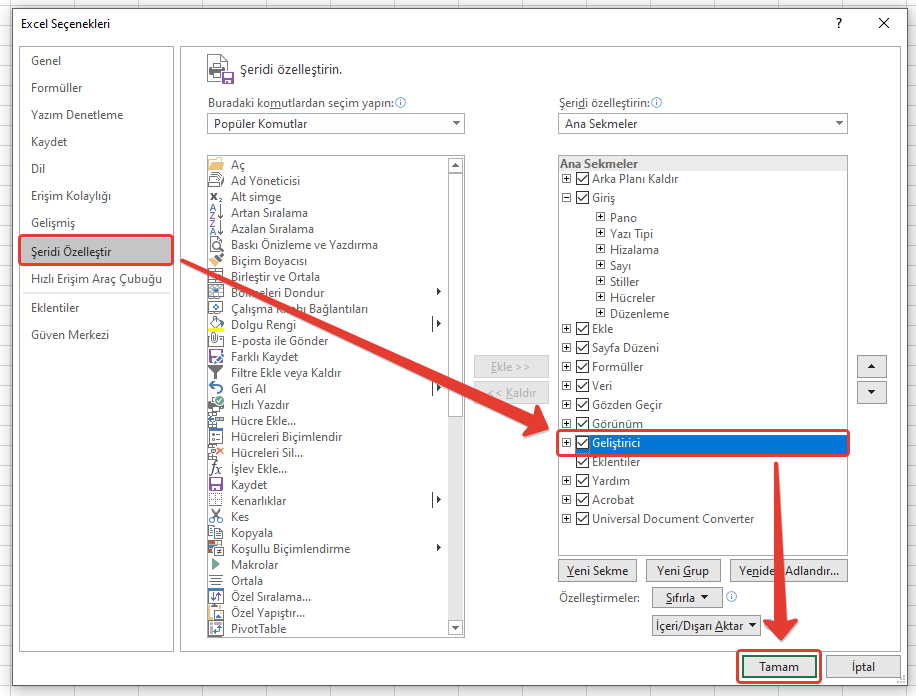 3- Seçenekler kısmını seçtikten sonra gelen pencereden “Şeridi Özelleştir” sekmesine gidelim ve burada “Geliştirici” yazan yerin solundaki kutucuğu seçili hale getirelim ve tamam diyelim.