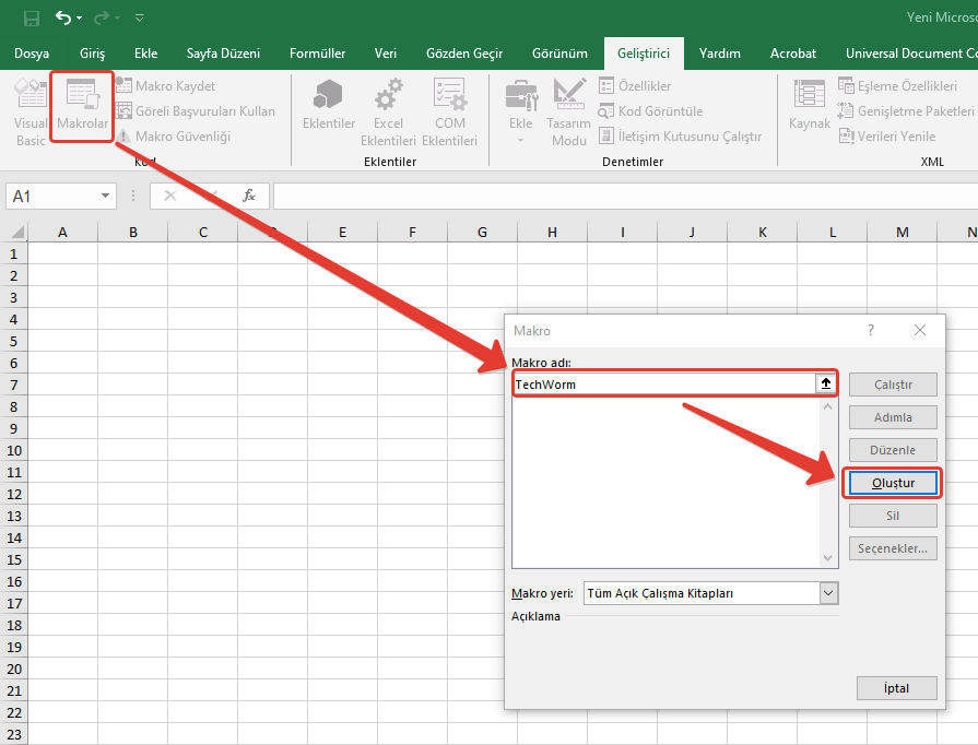 4- Şimdi sayfamızdan “Geliştirici” sekmesi aktif hale gelecektir. Burada “Makrolar” yazan yeri klikleyelim ve makromuza bir isim verip “Oluştur” diyelim.