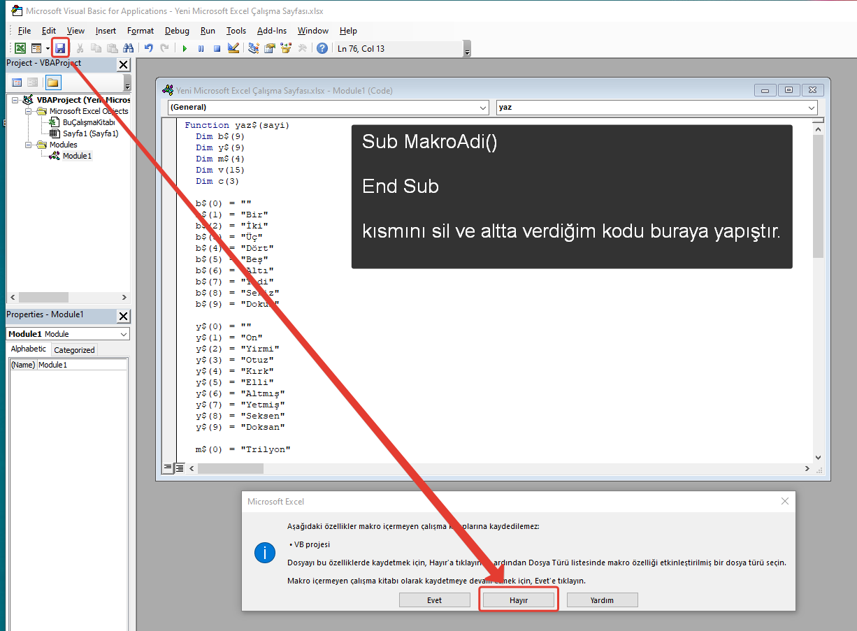 5- Oluştur dedikten sonra karşımıza bir ekran gelecek. İlk olarak buradaki “Sub MakroAdi() End Sub” kısmını silelim ve burada ki (tıkla) komutları buraya yapıştıralım. Ardından disket simgesini klikleyelim ve gelen uyarıya “HAYIR” diyelim.