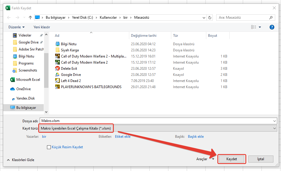 6- Bir kaydetme ekranı gelecek. Makromuzu kaydedeceğimiz rastgele bir isim ile bir alan belirleyelim ve kayıt türüne “Makro İçerebilen Excel Çalışma Kitabı” seçeneğini seçip “Kaydet” diyelim. Ardından tüm pencerelerimizi kapatalım ve kayıt ettiğimiz makro belgemizi açalım.