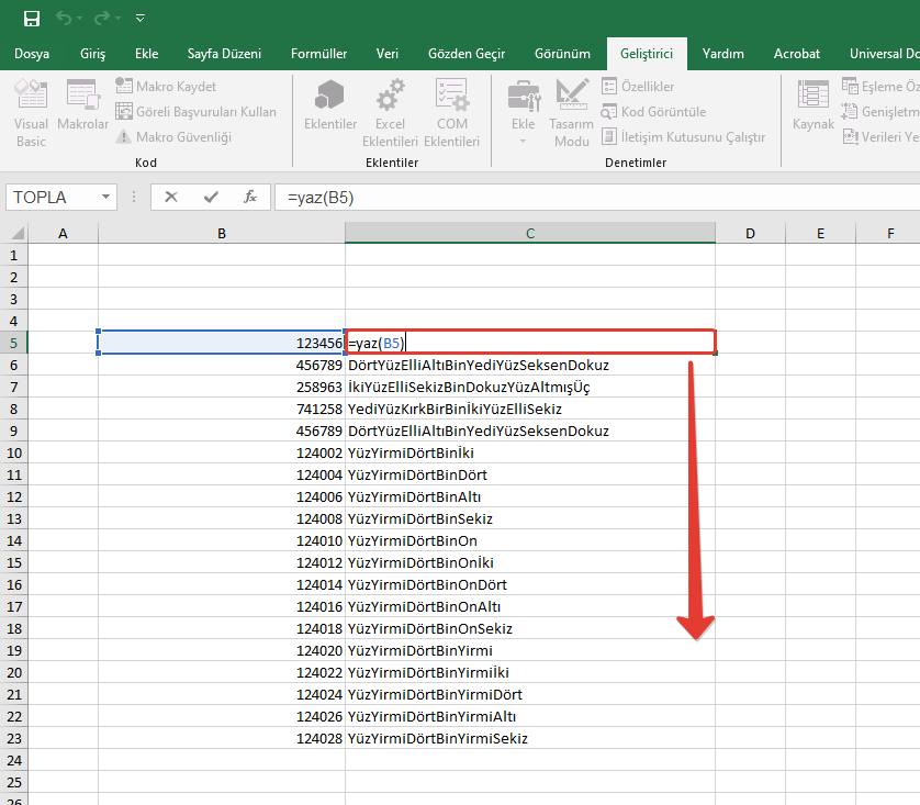 7- Son olarak Excel’de herhangi bir sayıyı veya rakamı yazıya/metne çevirmek için karşısındaki alana (farklı bir alanda olabilir) =yaz(HücreNoktası) | Örneğin: =yaz(B5) yazalım ve enter yapalım. Sayıları yazıya çevirme işlemi için ilgili sütunu aşağı doğru kaydırarak diğer sütunlara da uygulayabiliriz. İşlemimiz bu kadar.