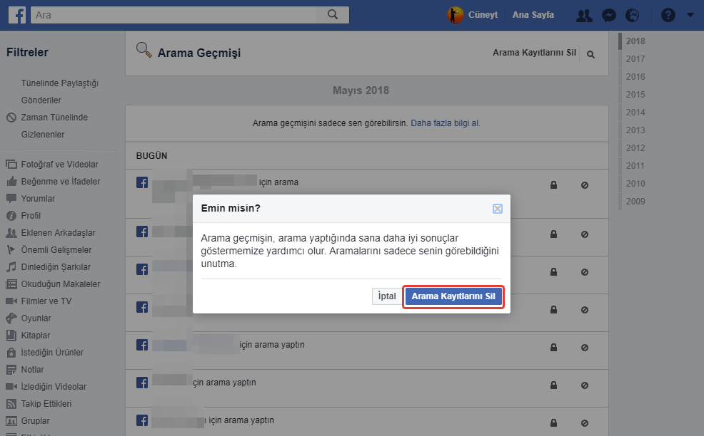 “Emin misin? Arama geçmişin, arama yaptığında sana daha iyi sonuçlar göstermemize yardımcı olur. Aramalarını sadece senin görebildiğini unutma.” Uyarısı çıkıyor ve “Arama Kayıtlarını Sil” diyoruz.