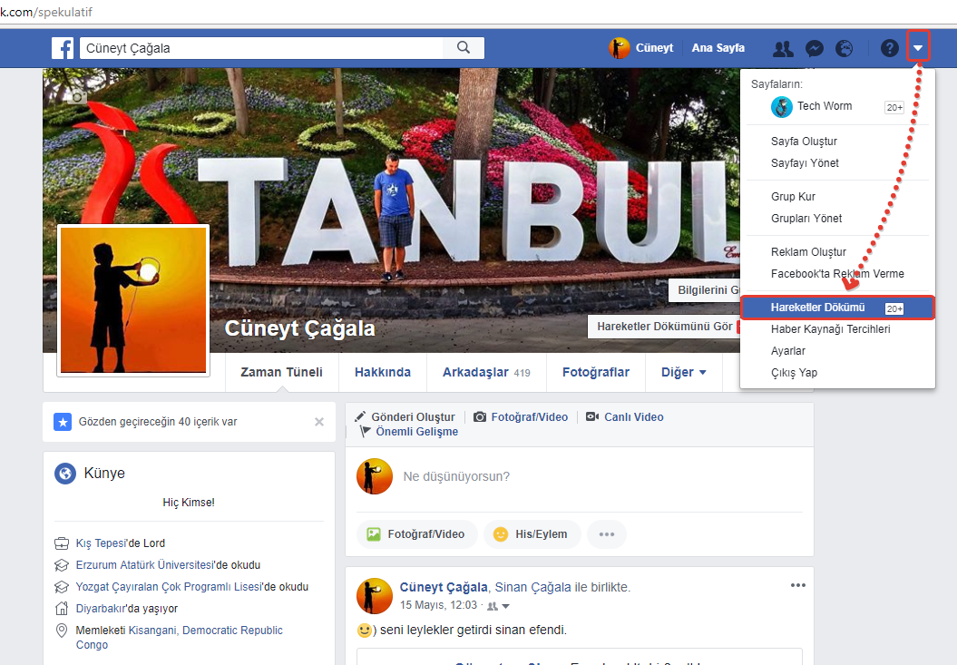 Öncelikle yapmamız gereken facebook (bilgisayadan) profil sayfasından sağ üstte soru işareti yanından bulunan ok işaretini klikliyoruz. Açılan panelden hareketler dökümünü seçiyoruz.