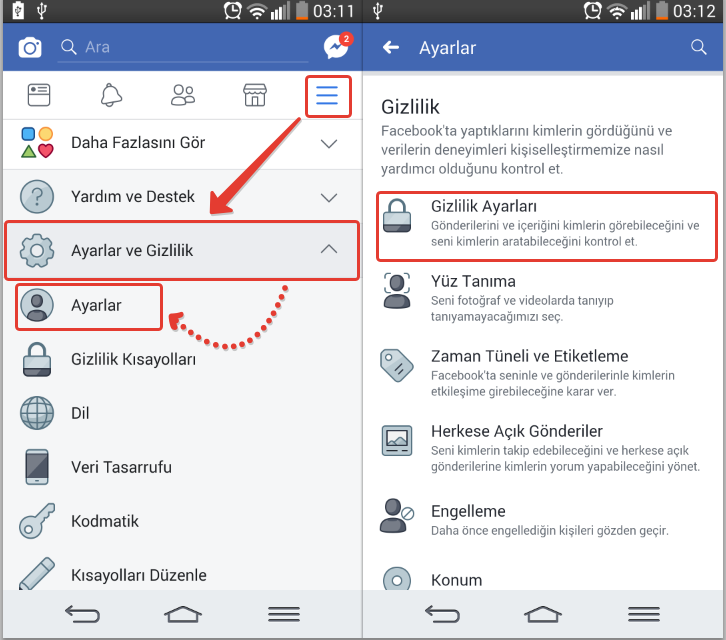 1- Telefondan Facebook uygulaması için sağ üstte bulunan yatay üç çizgi kısmını klikleyip aşağıda inerek “Ayarlar ve Gizlilik >>> Ayarlar” seçeneğini seçiyoruz. Devamında açılan sayfayı aşağı kaydırıp “Gizlilik Ayarları” yazan kısmı seçiyoruz.
