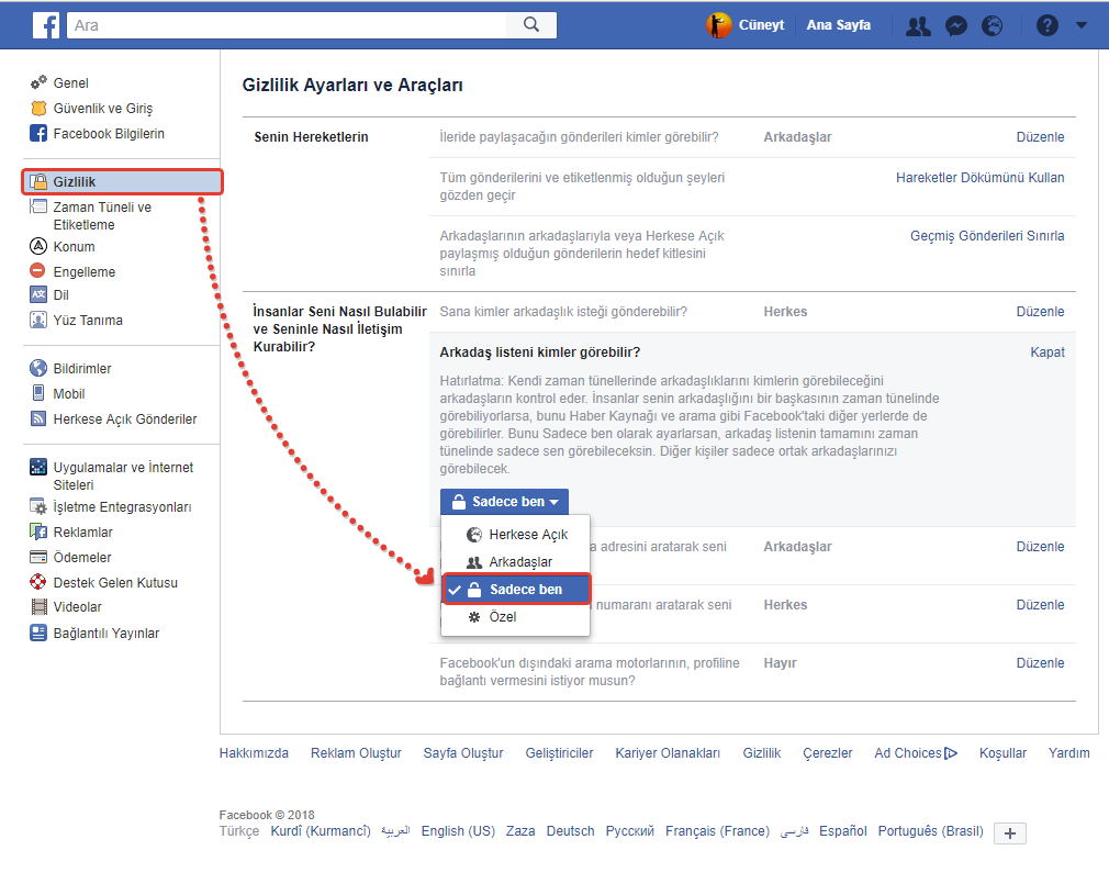 2- Son olarak devamında solda Gizlilik kısmını klikleyip açılan sayfada “Arkadaş Listenizi Kimler Görebilir?” seçeneğini “Sadece Ben” veya dilerseniz “Arkadaşlar” olarak değiştirebilirsiniz. Sadece ben yaptığınızda sizden başka kimse arkadaş listenizi görmez. Arkadaşlar yaptığınızda ise sadece arkadaşlarınız arkadaş listenizi görecektir.