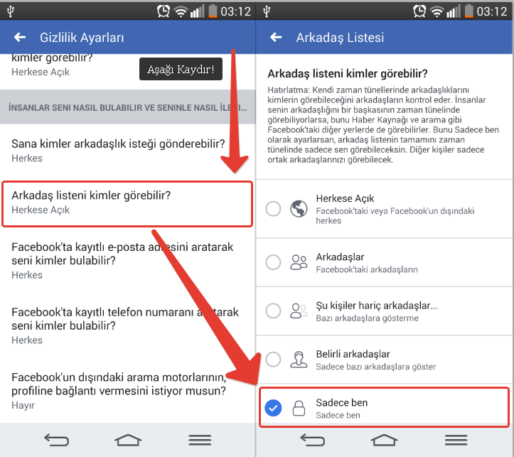 2- Tekrar aşağı kaydırıp “Arkadaş Listeni Kimler Görebilir” seçeneğini klikliyoruz. “Arkadaş Listenizi Kimler Görebilir?” seçeneğinde “Sadece Ben” veya dilerseniz “Arkadaşlar” olarak değiştirebilirsiniz. Sadece ben yaptığınızda sizden başka kimse arkadaş listenizi görmez. Arkadaşlar yaptığınızda ise sadece arkadaşlarınız arkadaş listenizi görecektir.