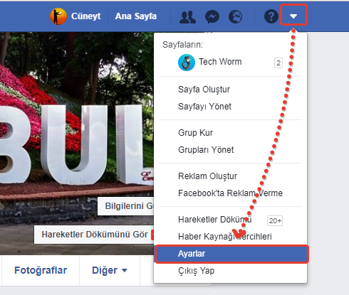 1- Eğer masaüstü bilgisayar veya laptop kullanıyorsanız facebook profilinizden sağ üstte bulunan ok simgesine klikleyip Ayarlar menüsünü seçin.