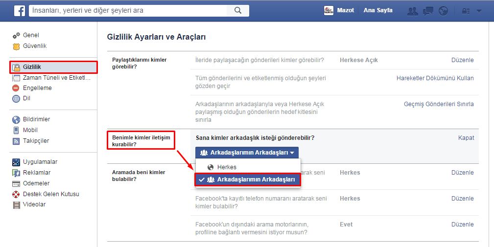 Açılan pencerede GİZLİLİK sekmesine gelin ve Benimle kimler iletişim kurabilir? Sana kimler arkadaşlık isteği gönderebilir? yazan yerin sağındaki DÜZENLE kısmını seçin. Ve HERKES yazan yeri Arakadaşımın Arkadaşları olarak belirleyin. ÖNEMLİ NOT: Hiçkimse diye bir seçenek yoktur. Sadece herkese kapatabiliyorsunuz.