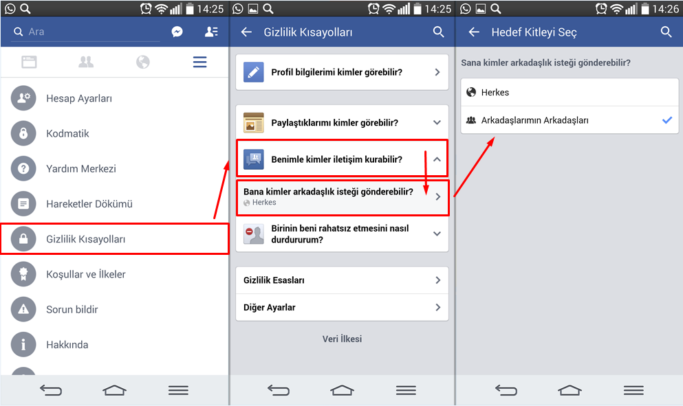 Telefonda arkadaşlık isteğini kaptmak için hemen sağ üstteki üç çizgiye klileyin ve aşağıya doğru indiriğinizde Gizlilik Kısayolları yazan yeri bulun onu seçin. Ardından Benimle kimler iletişim kurabilir? yazan yeri seçtiğinizde altına Sana kimler arkadaşlık isteği gönderebilir? sekmesi gelecek. Bunu seçtiğinde Herkes yazan yeri Arkadaşlarımın arkadaşı olarak seçin. NOT: Hiçkimse diye bir seçenek yoktur. Sadece herkese kapatabiliyorsunuz.