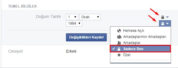 Not: Burada dikkat edilecek kısım facebook’ta yukarıdaki foroğrafta olduğu gibi doğum tarihinin gün/ay ile tarihi ayrı ayrı gizleme veya açma seçenekleri yapılıyor. Tamamen gizlemek istiyorsanız ikisi için ayrı ayrı Sadece Ben kısmını seçmelisiniz.