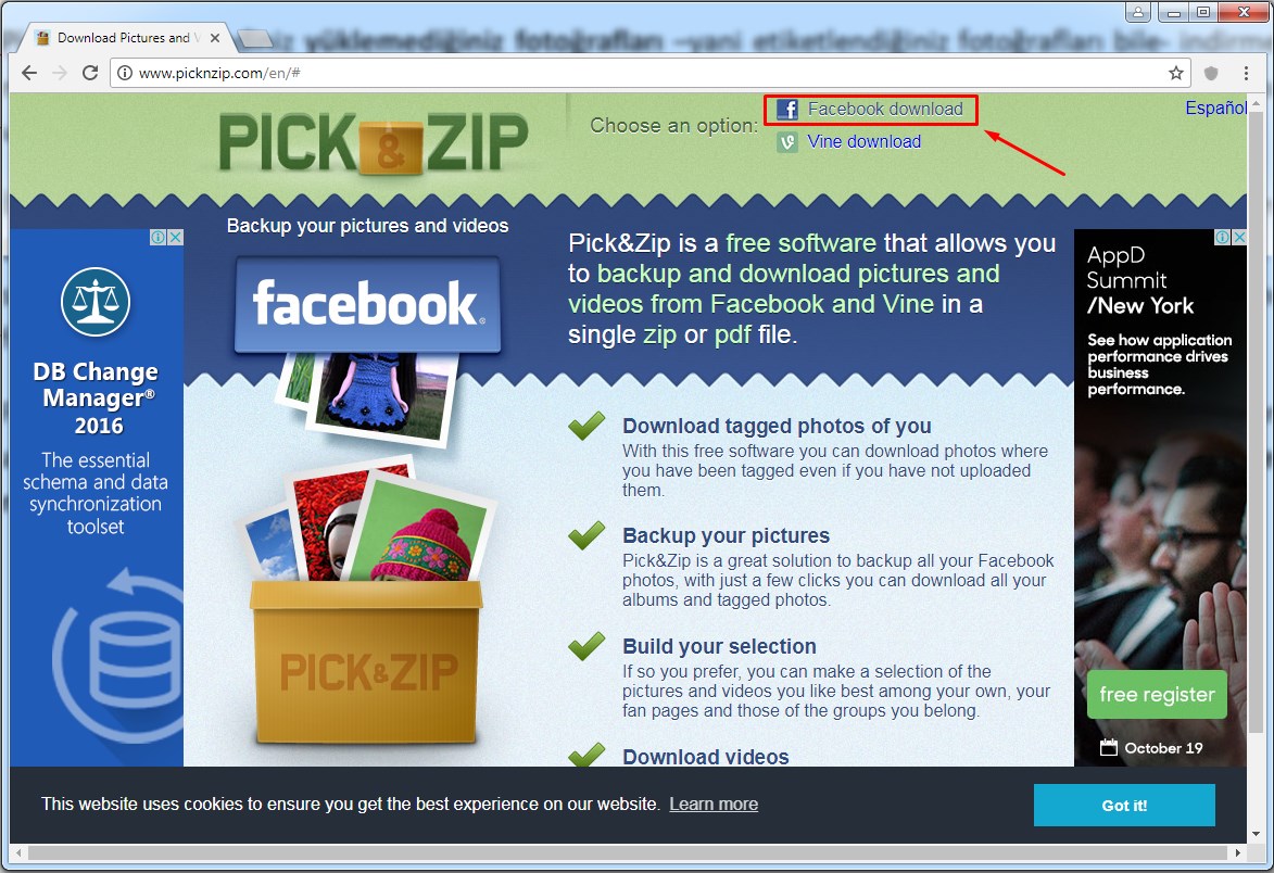 1- http://www.picknzip.com/en/ sayfasına gidin ve sağ üstte bulunan Facebook Download butonunu klikleyin.