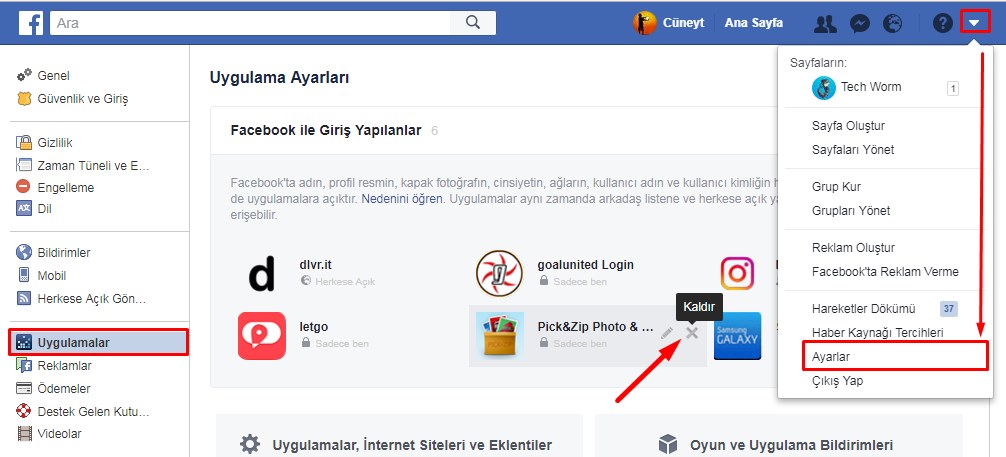 9- Son olarak bu web sitesi ile işimiz bittiğinde güvenliğiniz için facebook profil ana sayfasından altta görüldüğü gibi sağ üst köşedeki ikona klikleyerek AYARLAR >>> UYGULAMALAR diyoruz ve Pick&ZİP Photo & Videos uygulamasını KALDIR diyoruz.