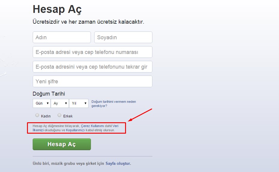 Hepimiz Facebook’a üye olurken bir sözleşmeyi onaylayarak üye oluruz. Hesap Aç dediğiniz anda Facebook’un Çerez Kullanımı dahil Veri İlkelerini ve Koşullarını kabul etmiş olursunuz.