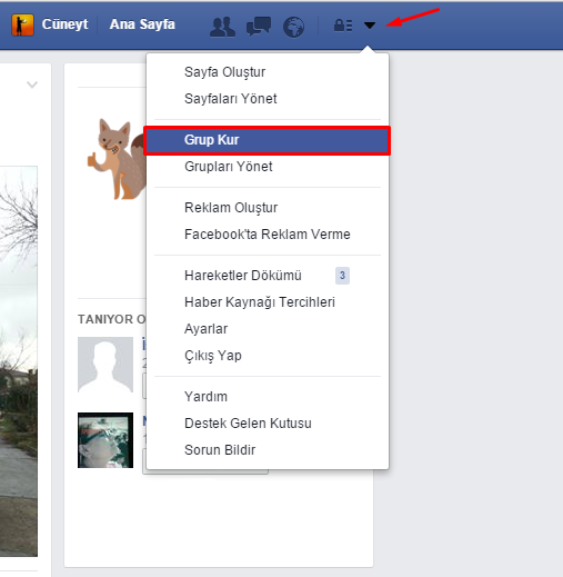 Öncelikle Facebookta bir grup kurmanız için bir facebook hesabınızın olması gerekiyor. Facebook hesabınız olmadan doğrudan grup kuramıyorsunuz. Hesabınızla giriş yaptıktan sonra sağ üstte (aşağıda gösterdiğim gibi) ok ikonuna klikleyin. Açılan pencerede Grup kur seçeneğini seçin.