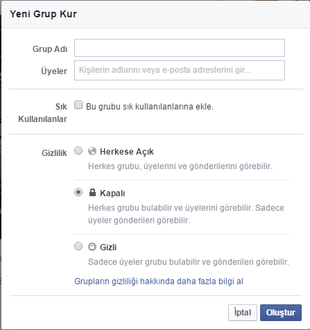 Grup kur dedikten sonra aşağıdaki gibi bir pencere açılacaktır. Bu pencerede sizlere grup bilgileri için doldurmanız gereken alanlar olacaktır. Grup adını belirlerken facebookun izin verdiği isimlerden olması gerekiyor. Dilediğiniz herhangi bir isme izin vermeyebilir. Ancak çoğunlukla istediğiniz ismi kabul ediyor. Üyeler kısmında ise 5-6 arkadaşınızdan eklemeniz gerekiyor. Ekleme yapmadan grup kurmanıza izin verilmez. Sık kullanılanlar kısmına eklediğinizde anaysafada sekmesini kliklediğinizde grubunuzun adı sol üstte çıkar. Herkese Açık dediğinizde dileyen gelir katılır veya üye olur. Ve herkes paylaşımlarınızı görür. Kapalı dediğinizde grup üyeliği için yönetici onayı yani sizin onayınız gerekir. Ve paylaşımları sadece üyeler görür. Gizli dediğinizde sadece sizin eklediğiniz kişiler paylaşımları görür.