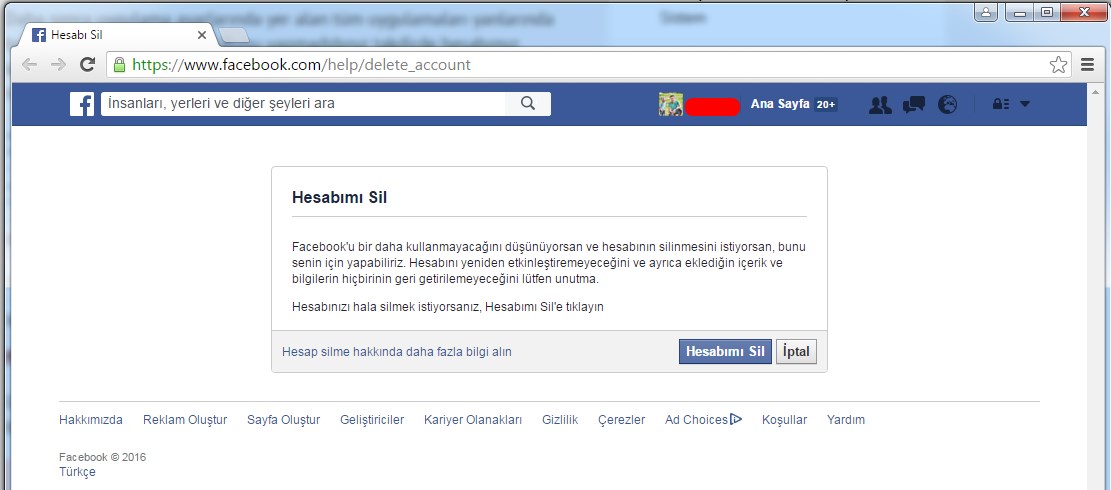 Herkese Merhaba. Bu yazımızda basit bir şekilde Facebook hesabınızın tamamen nasıl silineceğini kısaca anlatmaya çalışacağım. Burada dikkat etmeniz gereken husus facebook hesabının dondurulması işlemi değil tamamen kalıcı olarak silme işlemidir. Ve bu işlemin geri dönüşü yoktur. Facebook hesabını silmek istediğinizde şu uyarıyı alırsınız. “Facebook’u bir daha kullanmayacağını düşünüyorsan ve hesabının silinmesini istiyorsan, bunu senin için yapabiliriz. Hesabını yeniden etkinleştiremeyeceğini ve ayrıca eklediğin içerik ve bilgilerin hiçbirinin geri getirilemeyeceğini lütfen unutma. Hesabınızı hala silmek istiyorsanız, Hesabımı Sil‘e tıklayın”