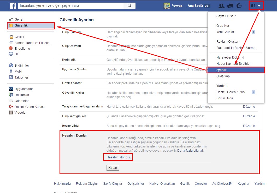 Menü >>> Ayarlar >>> Güvenlik >>> Hesabını Dondur.