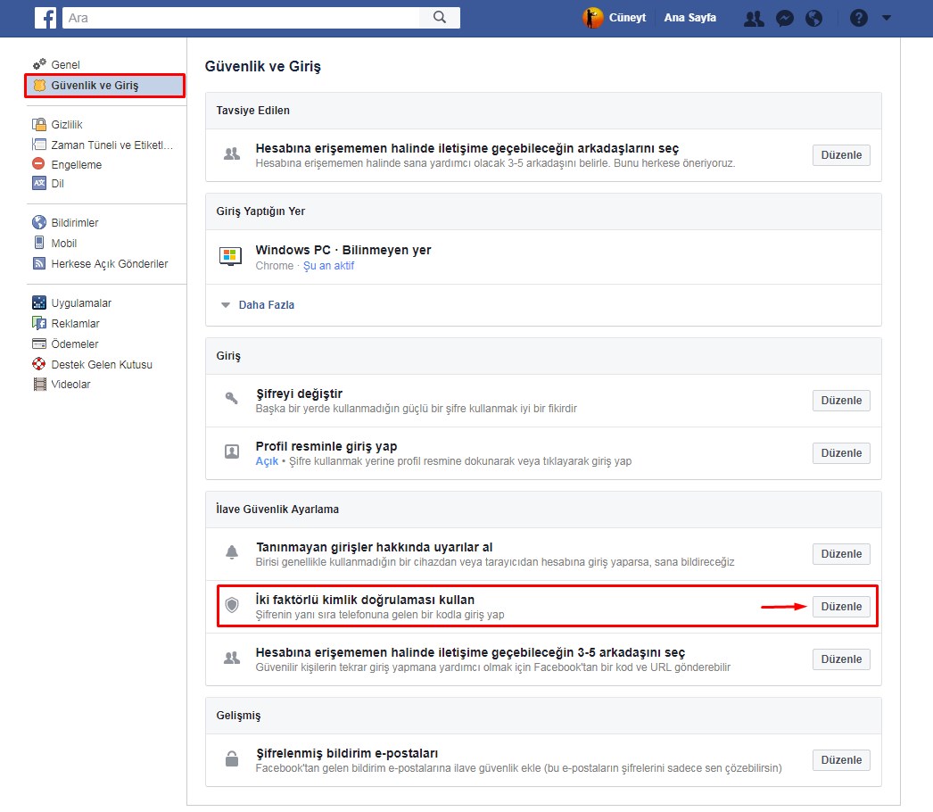 Facebook İki Faktörlü Kimlik Doğrulaması Ayarları