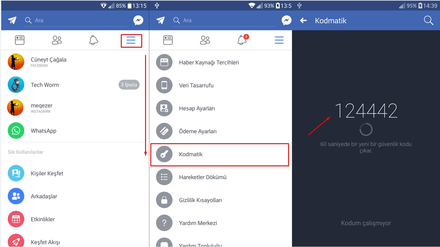 Bu kodu aşağıdaki gibi yatay üç çizgi sekmesinden kodmatik kısmına giderek kodu giriyorsunuz ve facebook sayfanız bilgisayardan açılıyor.