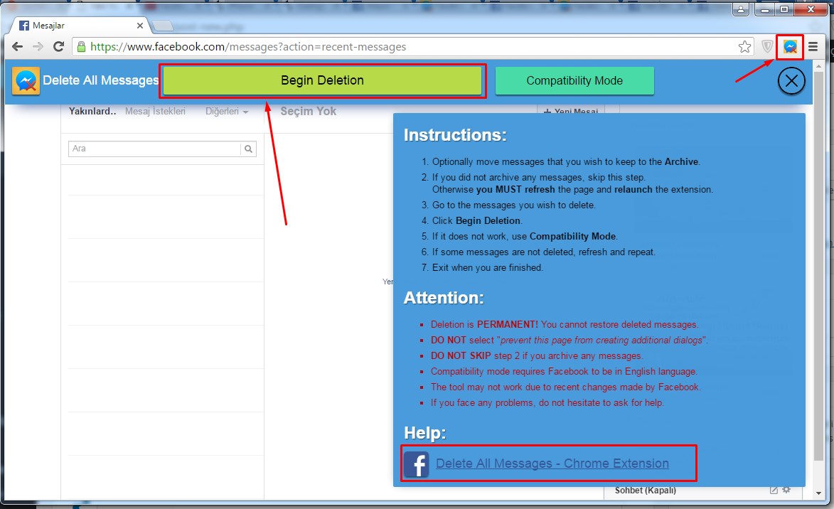 Aslında facebook’ta toplu bir şekilde mesaj silme seçeneği yok. Bunu silmenin tek yolu uygulama veya eklenti kullanmak. Tabi güvenilir bir uygulama veya eklenti ile silmeniz en doğrusu! Çünkü hesabınızın çalınma riski olduğunu belirtmekte fayda var.