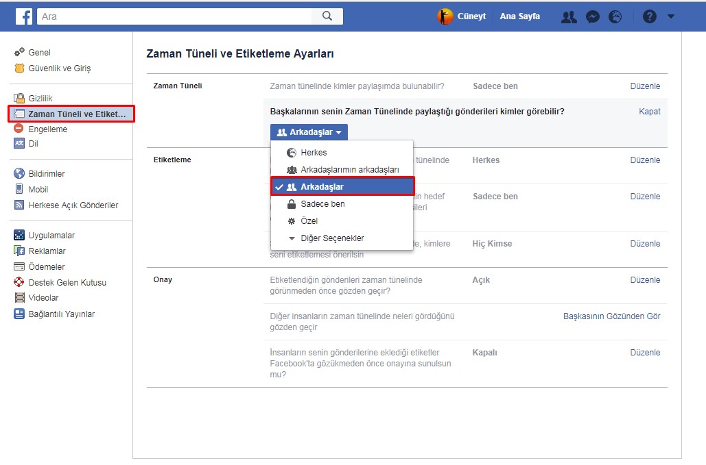 2- Açılan pencerede “Zaman Tüneli ve Etiketleme Ayarları” sekmesinin seçin seçin ve “Başkalarının Senin Zaman Tünelinde Paylaştığı Gönderileri Kimler Görebilir?” karşısında DÜZENLE yazan yeri klikleyin ve açılan pencerede kendinize göre yukarıda seçenekleri göre bir seçeneği belirleyin. Artık zaman tünelinizdeki paylaşımları belirlediğiniz kişiler veya siz görebileceksiniz.