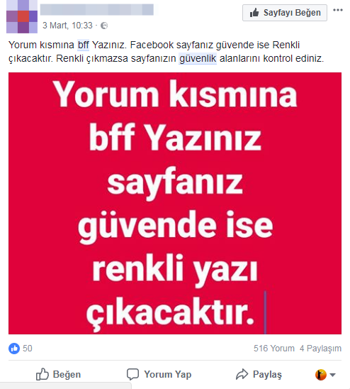 Son günlerde Facebook’ta herhangi bir yoruma “BFF” yazıldığında “yazı yeşil oluyorsa” hesabın güvende olduğuna dair iddialar dolaşmaya başladı. Tabi meraklı kullanıcılar böyle paylaşımlar gördüğünde hemen altında bulunan yorum kısımına BFF yazmaya başladılar bile. Paylaşımların altına BFF yazarak hesaplarının güvenli olup olmadığını kontrol eden kullanıcı sayısı şimdiden milyonları aştı bile.